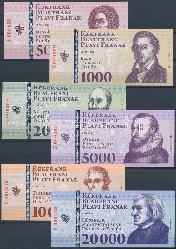 Sopron 2010. 500 Kékfrank + 1000 Kékfrank + 2000 Kékfrank + 5000 Kékfrank + 10.000 Kékfrank + 20.000 Kékfrank mind azonos "000269" sorszámmal, de eltérő sorozatjellel, teljes sor T:I