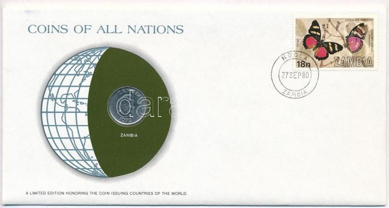 Zambia 1972. 5n "Nemzetek pénzérméi" felbélyegzett borítékban, bélyegzéssel, holland nyelvű leírással T:1- Zambia 1972. 5 Ngwee "Coins of all Nations" in envelope with stamp and stamping, with Dutch description C:AU