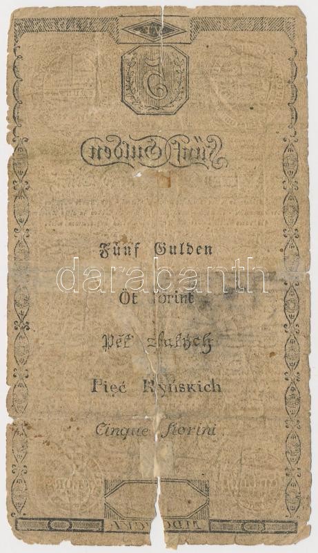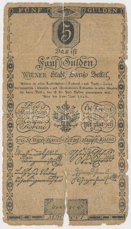 1806. 5G "Bécsi városi bankócédula" vízjeles papíron T:IV Ha... https://www.darabanth.com/de/342-Fernauktion/342.0/Numismatik/Ungarische-Banknoten~1500007/1806-5G-Becsi-varosi-bankocedula-vizjeles-papiron-TIV-Habsburg-Monarchy-1806-5-Gulden-Wi~II1927434