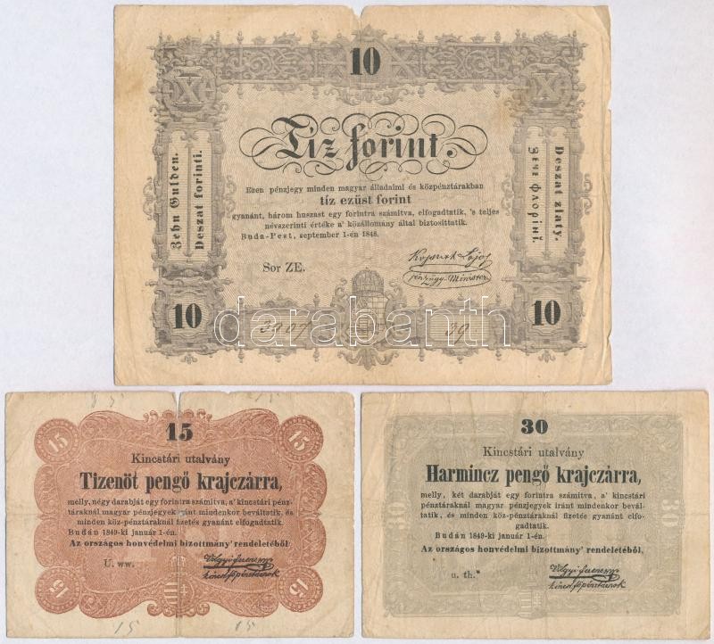 Beschreibung: 1848. 10Ft "Kossuth Bankó" + 1849. 15kr + 30kr T:III,III-