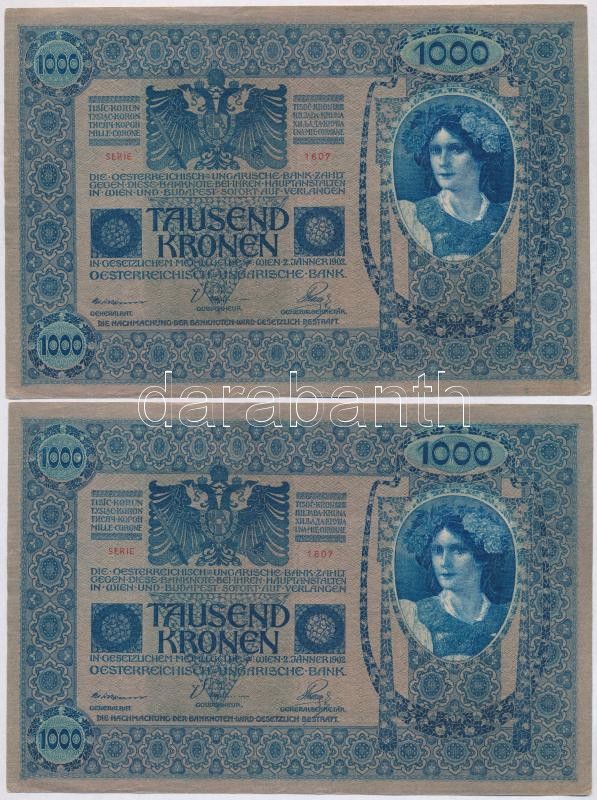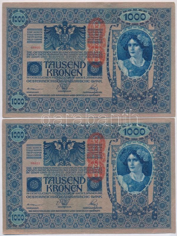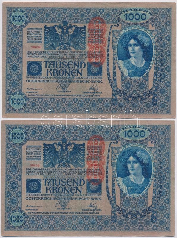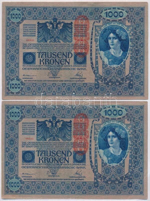 1902. 1000K (4x) sorszámkövetők, mindkét oldal német és "DEUTSCHÖ... https://www.darabanth.com/de/342-Fernauktion/342.0/Numismatik/Ungarische-Banknoten~1500007/1902-1000K-4x-sorszamkovetok-mindket-oldal-nemet-es-DEUTSCHOSTERREICH-felulbelyegzes~II1931998