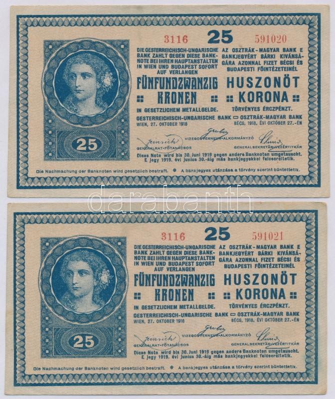 Beschreibung: 1918. 25K "3116" (2x) sorszámkövetők 3mm, hullámos hátlap, eltérő sorozat és sorszám T:I,I-