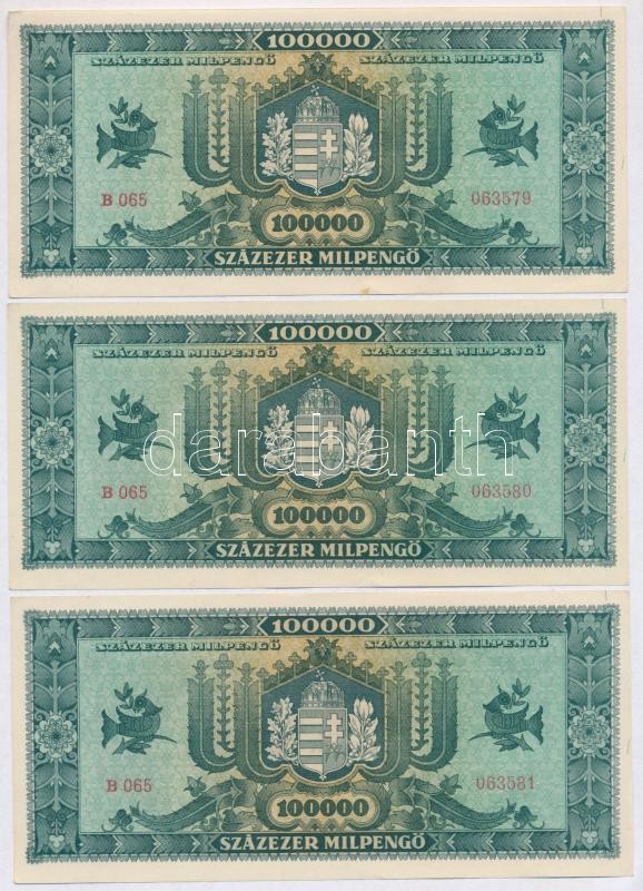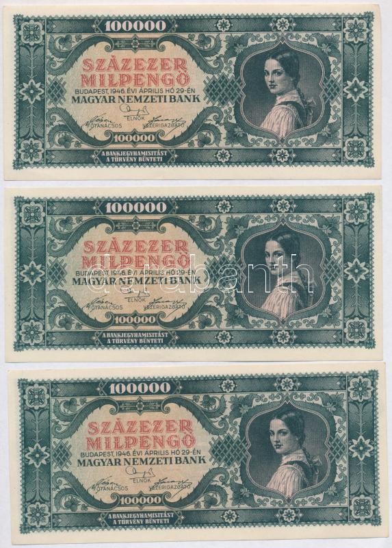 1946. 100.000MP (3x) sorszámkövetők T:I,I- https://www.darabanth.com/de/342-Fernauktion/342.0/Numismatik/Ungarische-Banknoten~1500007/1946-100000MP-3x-sorszamkovetok-TI-I-~II1931978