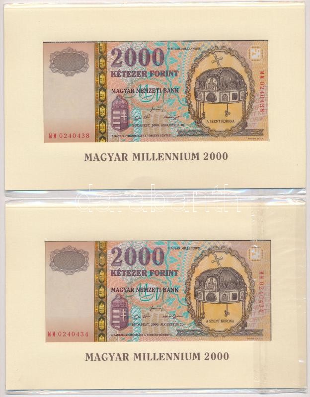 2000. 2000Ft "Millennium" (2x) eredeti csomagolásban, közeli... https://www.darabanth.com/de/342-Fernauktion/342.0/Numismatik/Ungarische-Banknoten~1500007/2000-2000Ft-Millennium-2x-eredeti-csomagolasban-kozeli-sorszamok-TI-Adamo-F56A~II1928810