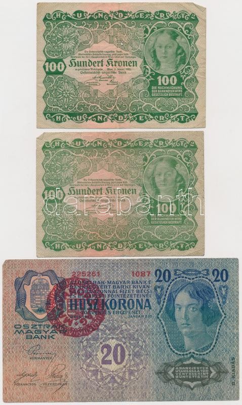 Beschreibung: Vegyes 10db-os korona bankjegy tétel, közte két osztrák darab illetve 1913. 20K II. kiadás, piros "MAGYARORSZÁG" körbélyegzővel T:III-IV