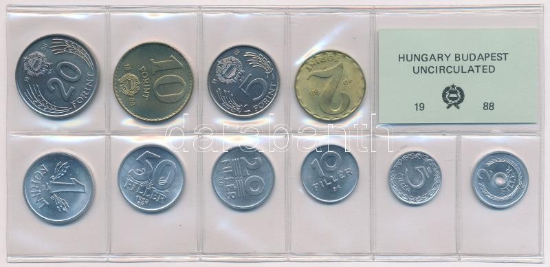1988. 2f-20Ft (10xklf) érmés forgalmi sor fóliatokban T:1 Adamo FO21 https://www.darabanth.com/de/342-Fernauktion/342.0/Numismatik/Ungarische-Munzen-und-Munzen-mit-ungarischem-Munzzeichen~1500008/1988-2f-20Ft-10xklf-ermes-forgalmi-sor-foliatokban-T1-Adamo-FO21~II1926743