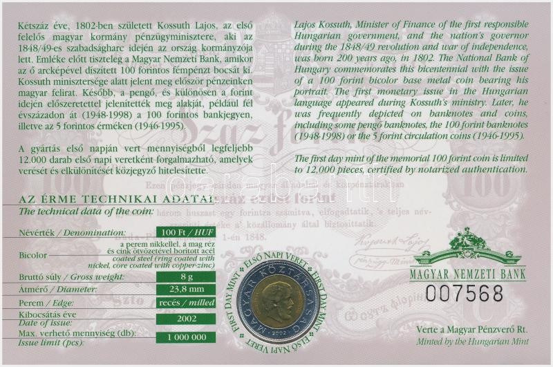 Beschreibung: 2002. 100Ft Ni-Cu-Zn "Kossuth" elsőnapi veret sorszámozott díszlapon T:BU