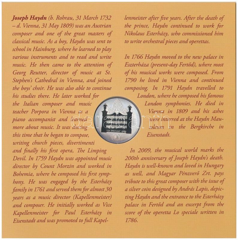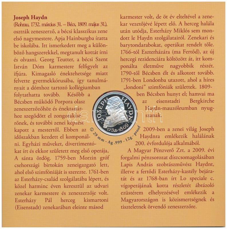 Beschreibung: 2009. 5Ft-200Ft "Haydn" (7xklf) forgalmi érme sor, benne "Joseph Haydn" Ag emlékérem (12g/0.999/29mm) T:PP kis patina