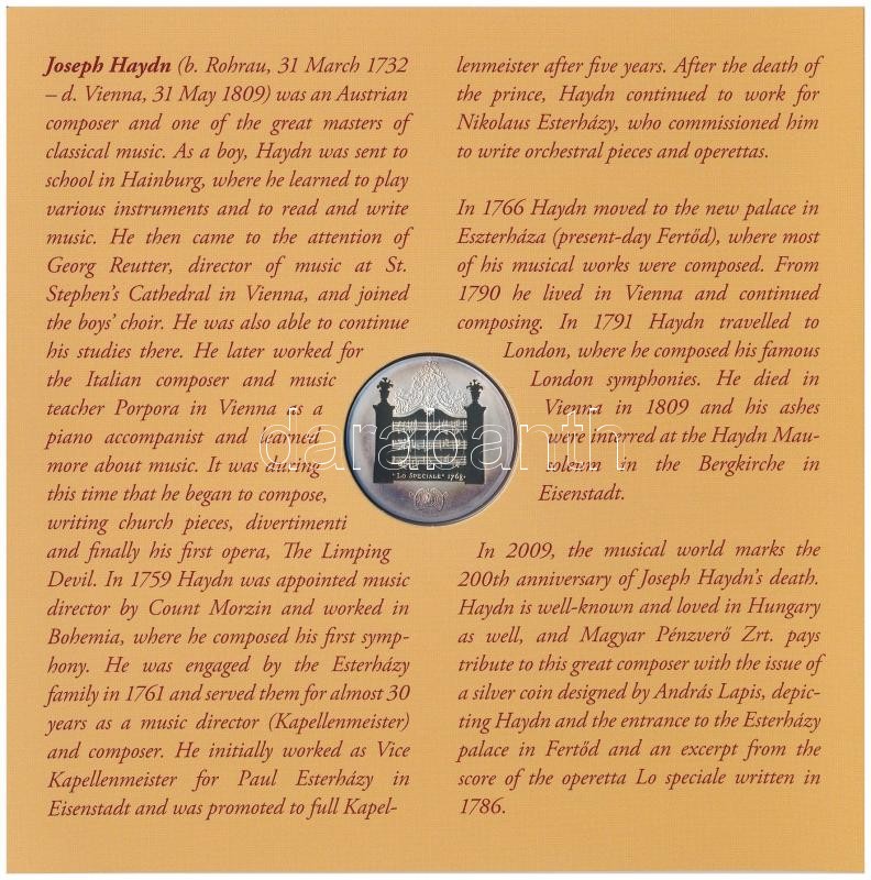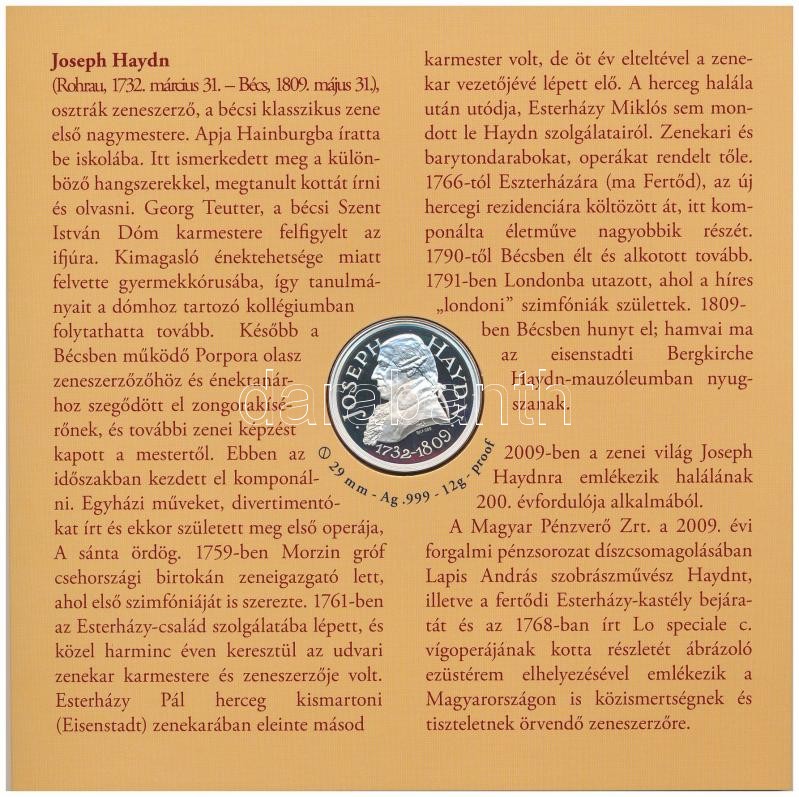 Beschreibung: 2009. 5Ft-200Ft "Haydn" (7xklf) forgalmi érme sor, benne "Joseph Haydn" Ag emlékérem (12g/0.999/29mm) T:BU patina