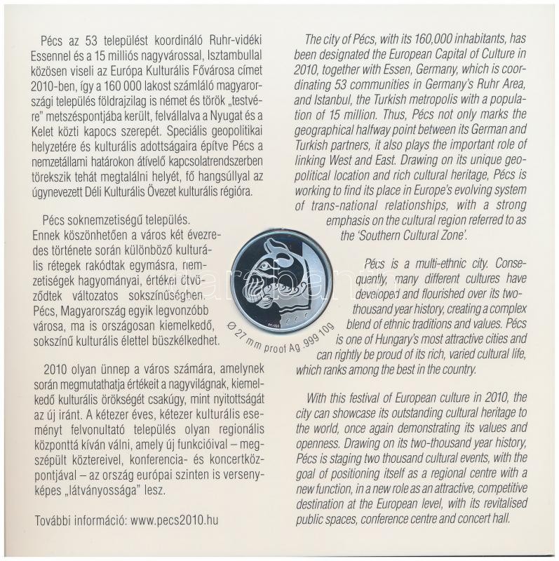 2010. 5Ft-200Ft (6xklf) forgalmi sor dísztokban, valamint 2010. "Pécs 2010 - Európa Kulturális Fővárosa" Ag emlékérem (10g/0.999/27mm), "Magyarország pénzérméi" sorozat T:PP patina