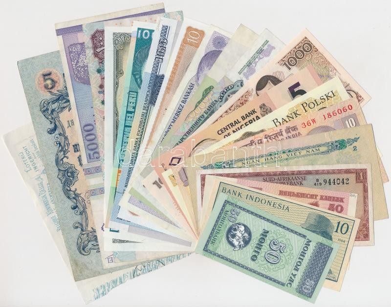 20db-os vegyes bankjegy tétel a világ minden tájáról, közte Dél-Afrika, Orosz Birodalom, Indonézia, India, Chile, Jugoszlávia, Lengyelország és Mongólia T:vegyes 20pcs of various banknotes from all olver the world, inlcuding South Afrika, Russian Empire, Indonesia, India, Chile, Yugoslavia, Poland and Mongolia C:mixed