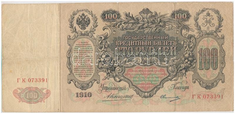 Orosz Birodalom 1909-1912. (1910) 100R Szign.: Konshin + 1912-1917. (1... https://www.darabanth.com/de/342-Fernauktion/342.0/Numismatik/Weltweit-Banknoten~1500012/Orosz-Birodalom-1909-1912-1910-100R-Szign-Konshin-plus-1912-1917-1912-500R-Szign-Shipov-TIII~II1929899