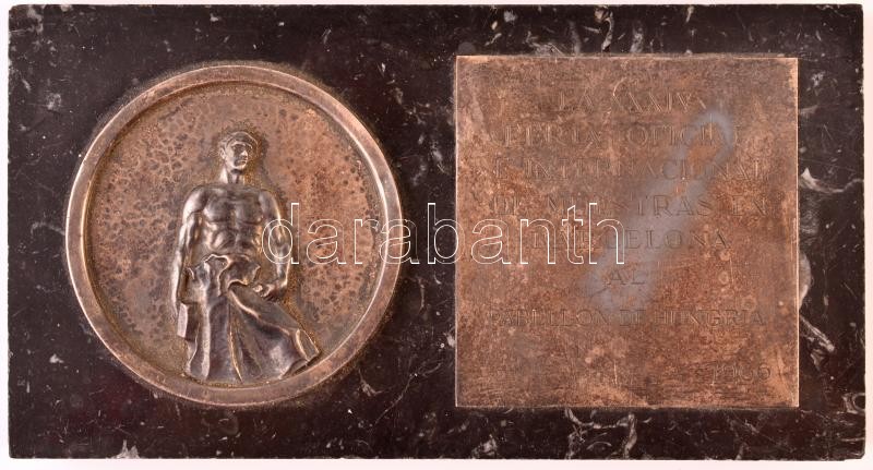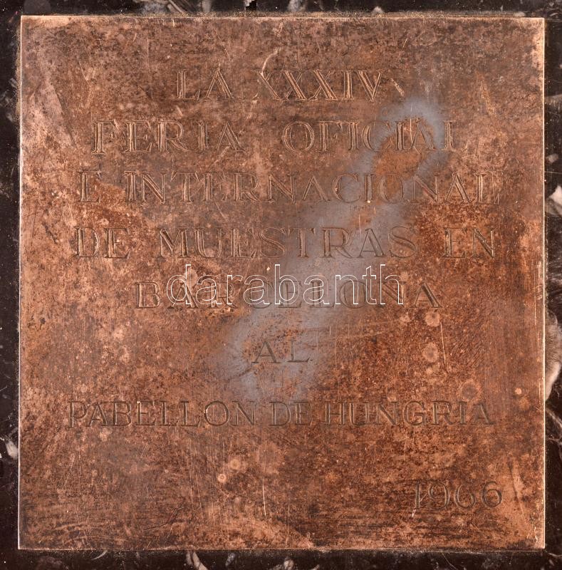 Spanyolország 1966. "LA XXXIV FERIA OFICIAL E INTERNACIONAL DE MUESTRAS EN BARCELONA AL PABELLON DE HUNGRIA (34. Hivatalos nemzetközi mintabemutató, magyar pavilon)" Ag lemezplakettek márványhasábon (69mm és 71x70mm, márványhasáb 93x176mm) T:2 Spain 1966. "LA XXXIV FERIA OFICIAL E INTERNACIONAL DE MUESTRAS EN BARCELONA AL PABELLON DE HUNGRIA" Ag plate plaques on marble sheet (69mm and 71x70mm, marble sheet 93x176mm) C:XF
