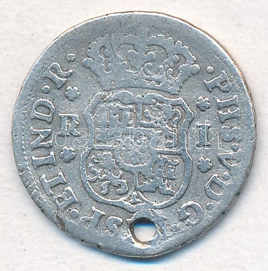 Mexikó 1745M 1R Ag "III. Károly" (3,02g) T:3 ly. Mexico 1745M 1 Real Ag "Charles III" (3,02g) C:F hole Krause KM#78.2
