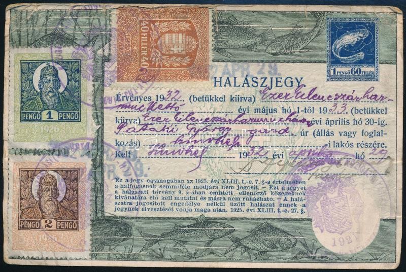 1932 Halászjegy Hódmezővásárhelyről 1,60P benyomott illetékbélyeggel ... https://www.darabanth.com/de/342-Fernauktion/342.0/Philatelie-und-Postgeschichte-Ungarn/Paraphilatelie~500016/1932-Halaszjegy-Hodmezovasarhelyrol-1-60P-benyomott-illetekbelyeggel-plus-3-40P-okmanybelyeg~II1931095