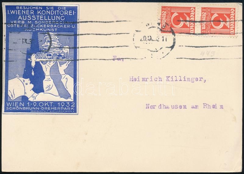 Beschreibung: 1932 Levelezőlap Bécsből, rajta az I. bécsi cukrászati kiállítás reklámbélyege