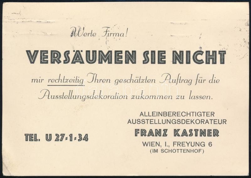 1932 Levelezőlap Bécsből, rajta az I. bécsi cukrászati kiállítás reklá... https://www.darabanth.com/de/342-Fernauktion/342.0/Philatelie-und-Postgeschichte-Ungarn/Paraphilatelie~500016/1932-Levelezolap-Becsbol-rajta-az-I-becsi-cukraszati-kiallitas-reklambelyege~II1896422