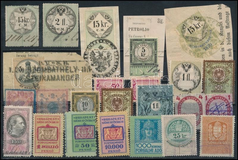 24 db régi magyar és osztrák okmánybélyeg https://www.darabanth.com/de/342-Fernauktion/342.0/Philatelie-und-Postgeschichte-Ungarn/Stempelmarken~500017/24-db-regi-magyar-es-osztrak-okmanybelyeg~II1931752