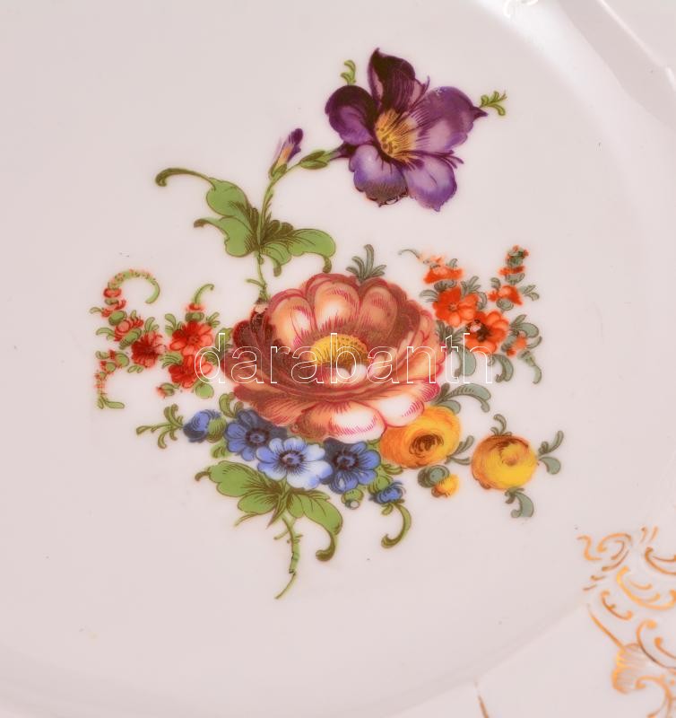 Beschreibung: Alt-Meissner, Schlagenwald tál, tányérok, tálon apró lepattanással és festék hibával, aranyozás erősen kopott, összesen: 4 db, d:18,5-25 cm, 36×27 cm