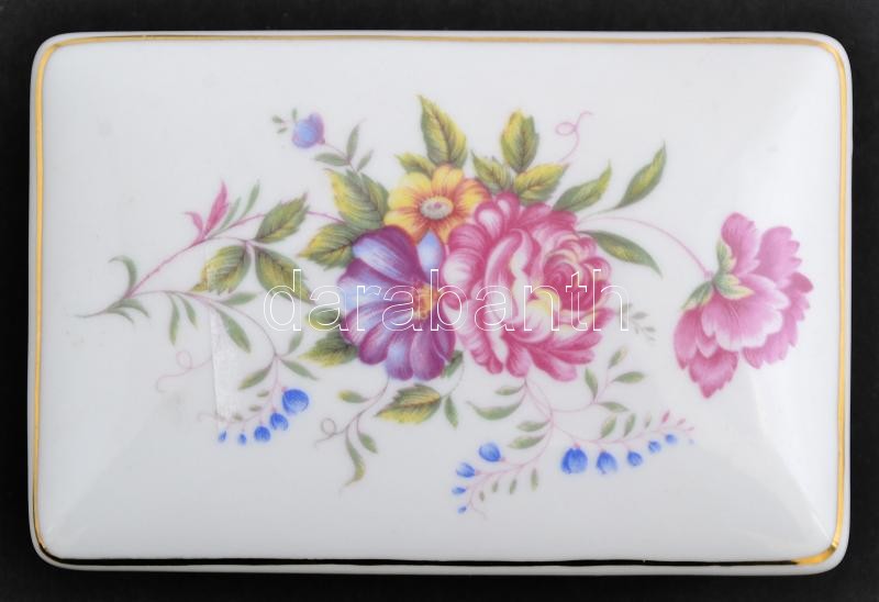 Beschreibung: Hollóházi virág mintás doboz, matricás, jelzett, apró kopás nyomokkal, 13,5×9 cm