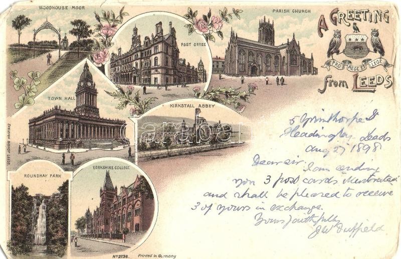 1898 Leeds, Woodhouse Moor, Post office, Parish church, Kirkstall Abbey, Town Hall, Yorkshire College, Roundhay Park. Eveleigh Bishop Art Nouveau, floral, litho (EM)
