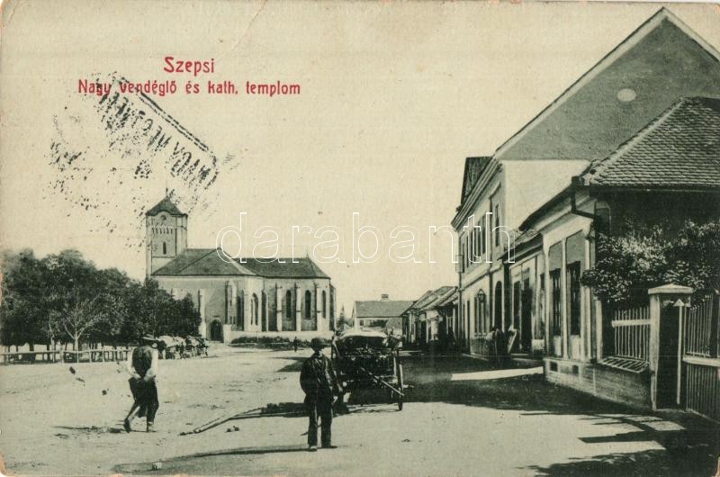 Szepsi, Abaújszepsi, Moldava nad Bodvou; Nagy vendéglő és a katolikus templom. W. L. Bp. 2638. / street view, restaurant, Catholic church (kis szakadás / small tear)