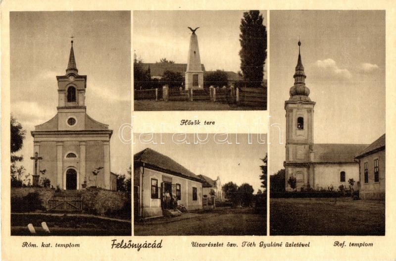 Beschreibung: Felsőnyárád, Római katolikus templom, Református templom, Hősök tere, hősök szobra, emlékmű, utcakép Özv. Tóth Gyuláné üzletével