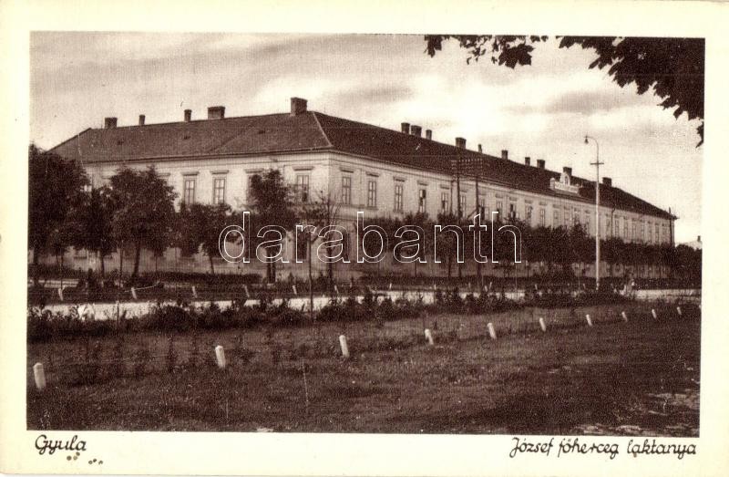 Gyula, József főherceg laktanya. Kiadja a Schenk hírlapiroda https://www.darabanth.com/de/343-Fernauktion/343.0/Ansichtskarten/Ungarn~2000008/Gyula-Jozsef-foherceg-laktanya-Kiadja-a-Schenk-hirlapiroda~II1933702