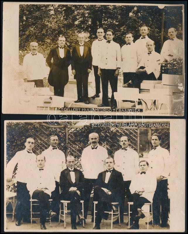 1928 Szt. Gellért Hotel Hullámfürdő pincérei. Két fotólap aláírásokkal https://www.darabanth.com/de/343-Fernauktion/343.0/Fotografie/Foto~500021/1928-Szt-Gellert-Hotel-Hullamfurdo-pincerei-Ket-fotolap-alairasokkal~II1933417