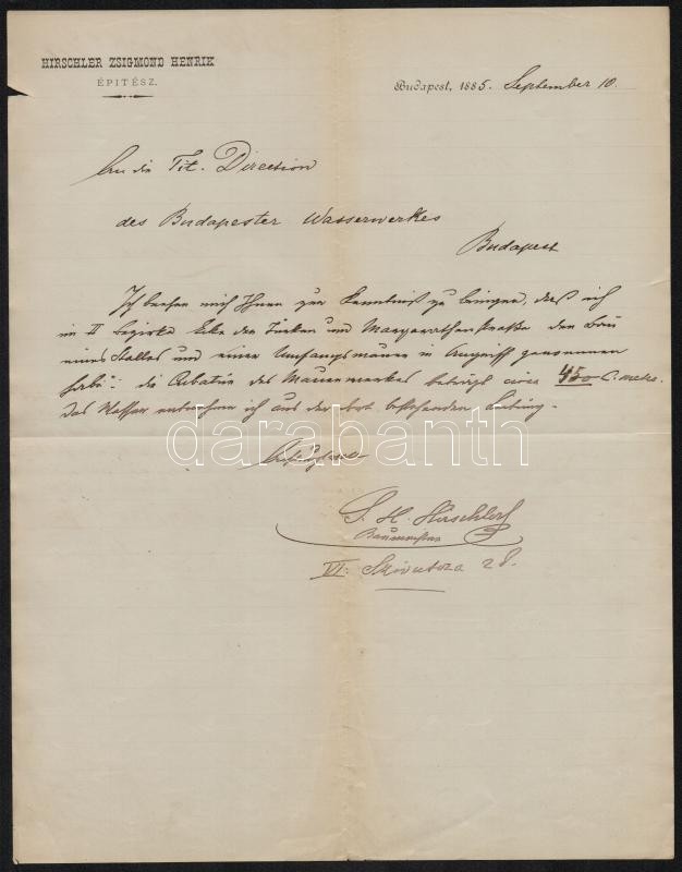 1885 Bp., Hirschler Zsigmond Henrik építész fejléces levélpapírjára ír... https://www.darabanth.com/de/343-Fernauktion/343.0/Kunst-Dokumente-andere-Sammelgebiete/Dokument~500018/1885-Bp-Hirschler-Zsigmond-Henrik-epitesz-fejleces-levelpapirjara-irt-level~II1935742