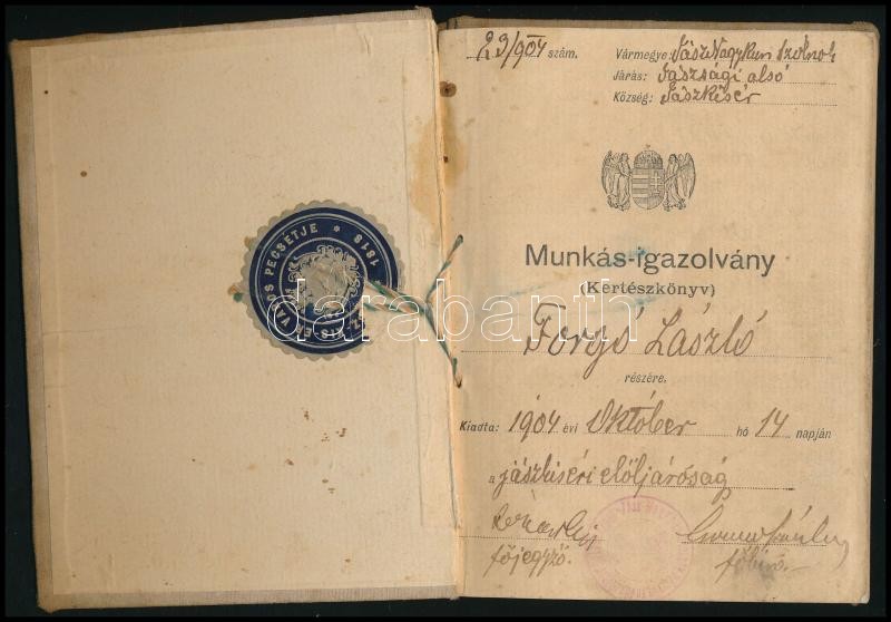 1904-1909 Jászkisér, munkás-igazolvány (kertészkönyv). Vászonkötésben,... https://www.darabanth.com/de/343-Fernauktion/343.0/Kunst-Dokumente-andere-Sammelgebiete/Dokument~500018/1904-1909-Jaszkiser-munkas-igazolvany-kerteszkonyv-Vaszonkotesben-laza-fuzessel~II1936863