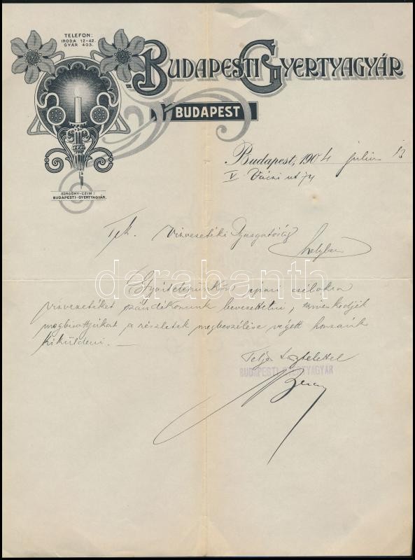 1904 Bp., Budapesti Gyertyagyár szecessziós fejléces levélpapírjára ír... https://www.darabanth.com/de/343-Fernauktion/343.0/Kunst-Dokumente-andere-Sammelgebiete/Dokument~500018/1904-Bp-Budapesti-Gyertyagyar-szecesszios-fejleces-levelpapirjara-irt-level~II1935634