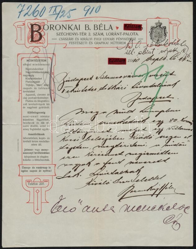 1910 Boronkai B. Béla Császári és Királyi Fhgi Udvari Fényképész szece... https://www.darabanth.com/de/343-Fernauktion/343.0/Kunst-Dokumente-andere-Sammelgebiete/Dokument~500018/1910-Boronkai-B-Bela-Csaszari-es-Kiralyi-Fhgi-Udvari-Fenykepesz-szecesszios-levelpapirjC3~II1935755