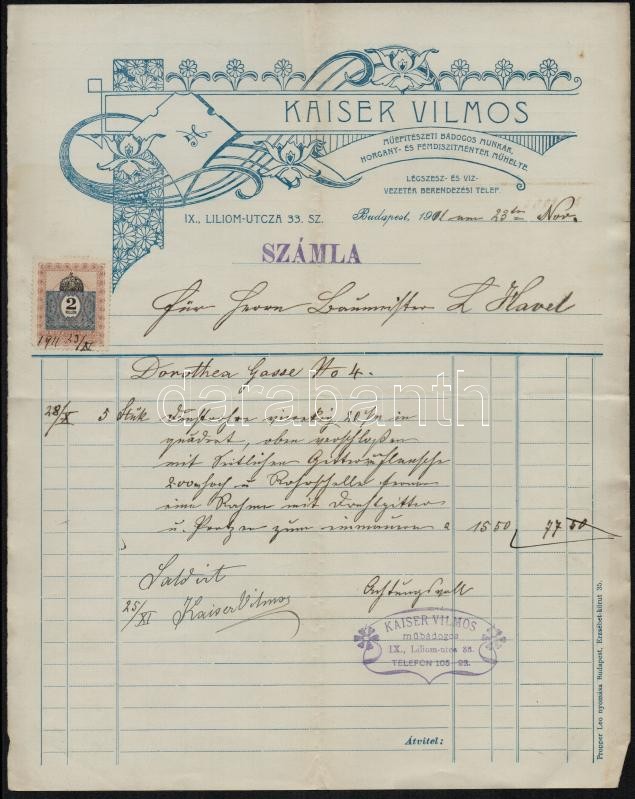 1911 Bp., Kaiser Vilmos Műépítészeti Bádogos Munkák Horgany- és Fémdís... https://www.darabanth.com/de/343-Fernauktion/343.0/Kunst-Dokumente-andere-Sammelgebiete/Dokument~500018/1911-Bp-Kaiser-Vilmos-Muepiteszeti-Badogos-Munkak-Horgany-es-Femdiszitmenyek-Muhelye-~II1935624
