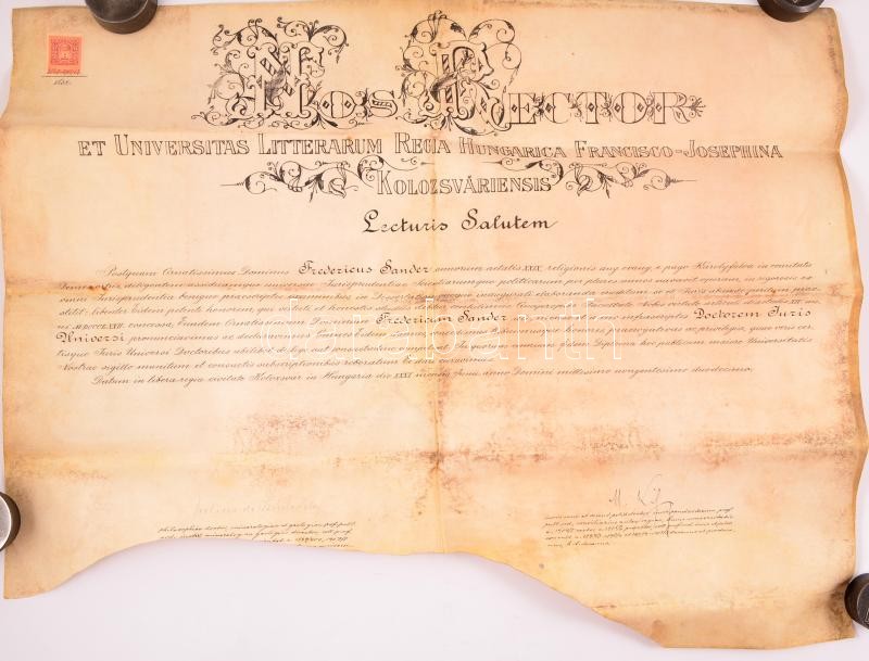 1911 Kolozsvár, M. Kir. Ferenc József Tudományegyetem jogi doktori oklevele, latin nyelven, 2 K. okmánybélyeggel. A rektor, Szádeczky-Kardoss Gyula (1860-1935) és Kiss Mór (1857-1945) dékán, korábbi rektor aláírásaival. Az oklevél alján hiány, a pecsét hiányzik.
