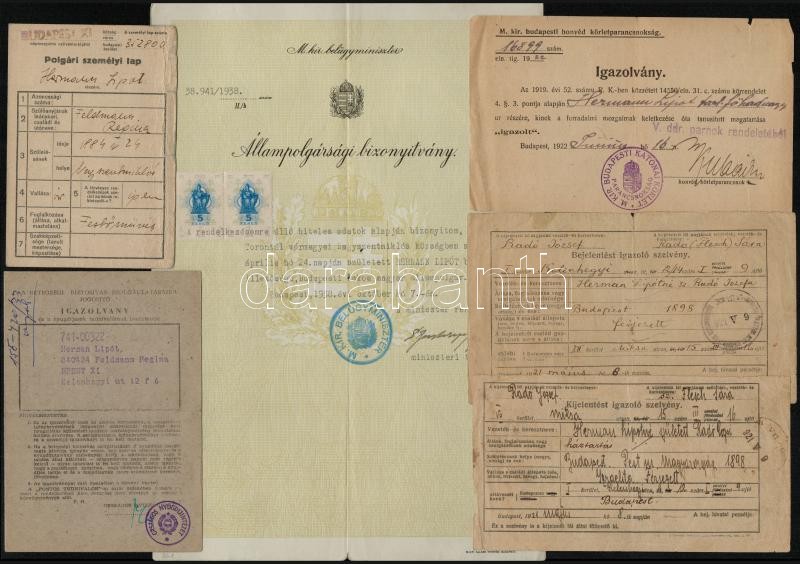 1915-1942 Herman Lipót (1884-1972) festőművész okmányai (polgári személyi lap, betegségi biztosító igazolvány, m. kir. honvéd körletparancsnokság által kiállított igazolvány, állampolgárisági igazolvány, stb.)