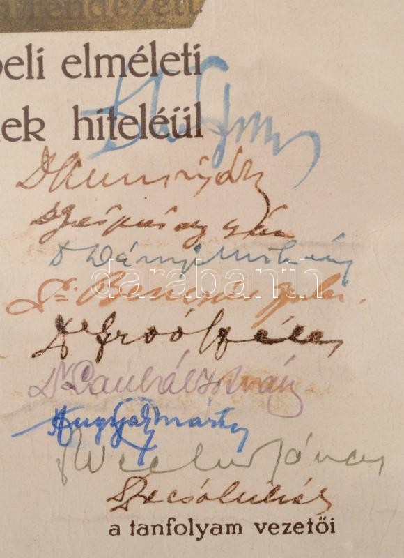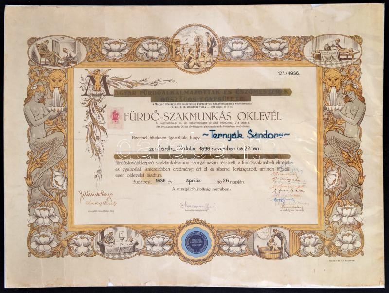 Beschreibung: 1936 a Magyar Fürdőalkalmazottak és Úszómesterek Országos Egyesülete díszes fürdőszakmunkási oklevele aláírásokkal, okmánybélyeggel