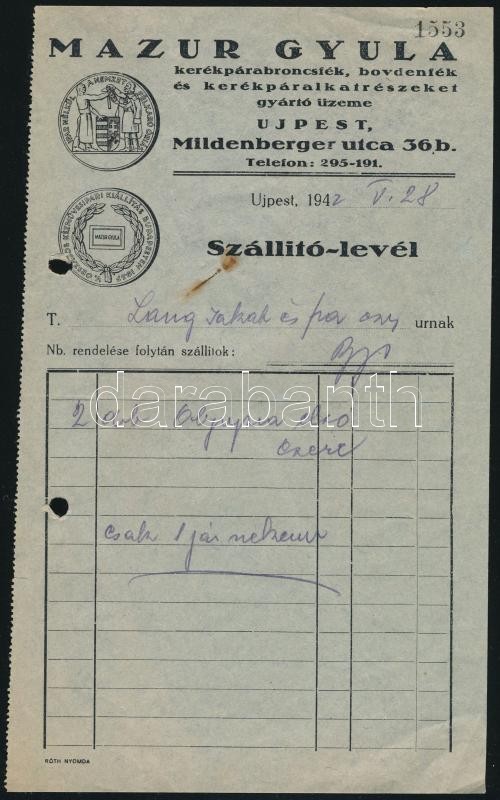 Beschreibung: 1942 Újpest, Mazur Gyula kerékpárabroncsfék, bovdenek stb. gyártó üzemének fejléces szállítólevele