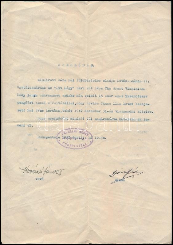 Beschreibung: 1943 Dunapentele, Dóra Pál (?-?) koronglövő világbajnok sportlövő "Itt Légy" nevű csikójának adásvételi szerződése, Pálhalmi Ménes bélyegzőjével, rajta aláírásokkal, közte Dóra Páléval is.