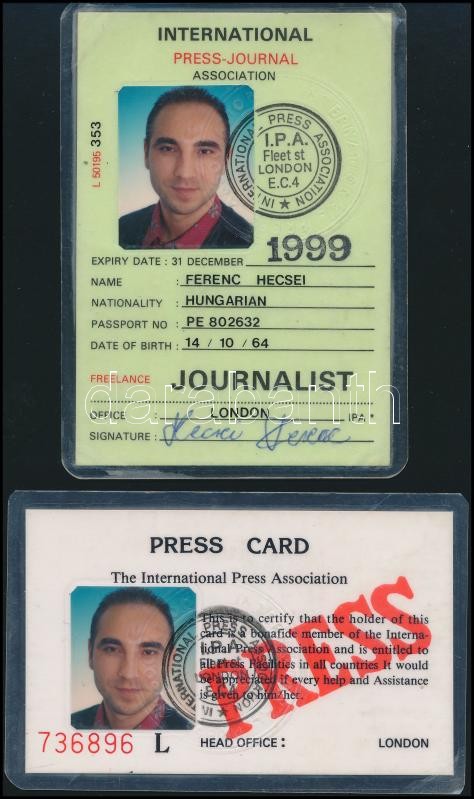 Beschreibung: 2 db arcképes nemzetközi sajtó igazolvány
