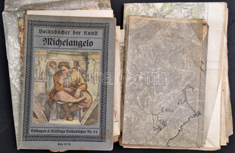 Vegyes papírrégiség tétel: 5 db katonai térkép, 20 db tábori posta, képeslapok, levelek, különféle okmányok, oklevelek, igazolványok, bizonyítványok, érdekes, átnézésre érdemes anyag