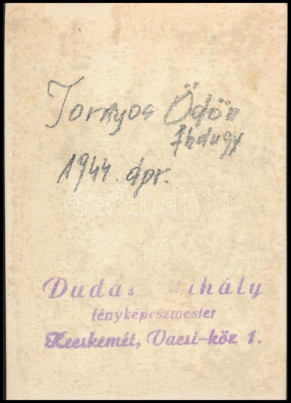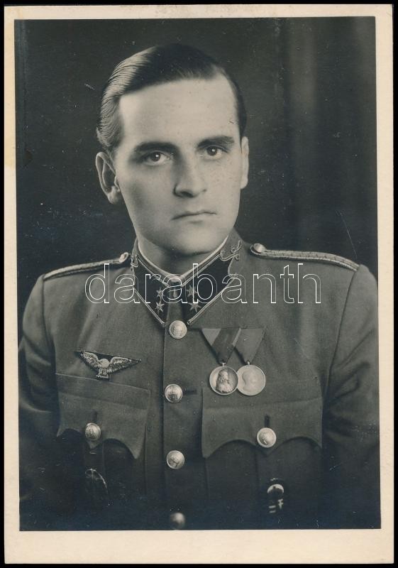 Beschreibung: 1944 Tornyos Ödön, a M. Királyi Honvédség repülős főhadnagya kitüntetésekkel, vitézi rend jelvénnyel, pecséttel jelzett, 8,5×6 cm