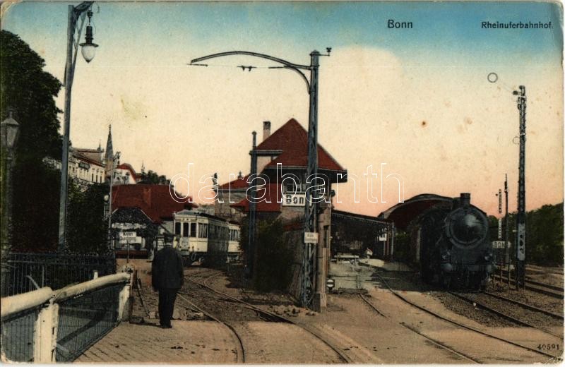 Bonn, Rheinuferbahnhof / railway station, locomotive, tram, railwayman... https://www.darabanth.com/de/344-Fernauktion/344.0/Ansichtskarten/Deutschland~1500034/Bonn-Rheinuferbahnhof-railway-station-locomotive-tram-railwayman-Reinicke-Rubin-EK~II1940748