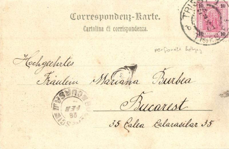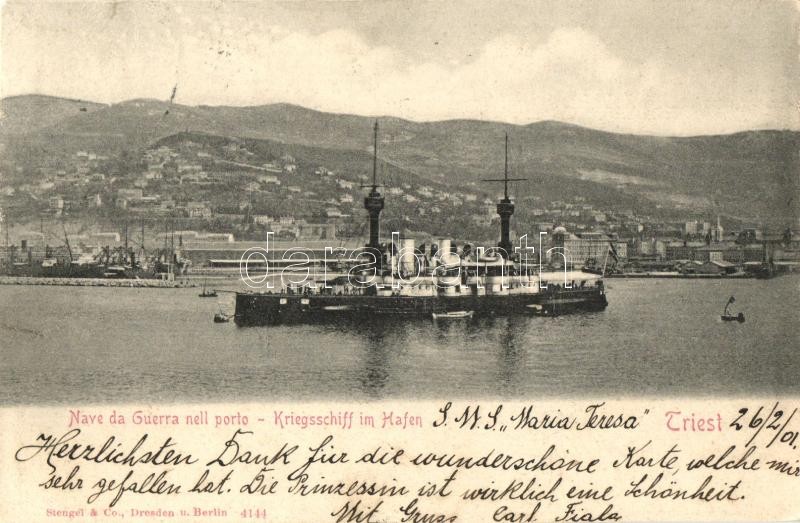 1901 Trieste, SMS Mária Terézia az Osztrák-Magyar Haditengerészet páncélos cirkálója / K.u.K. Kriegsmarine SMS Kaiserin und Königin Maria Theresia armored cruiser + perforált bélyeg / perforated stamp on the backside