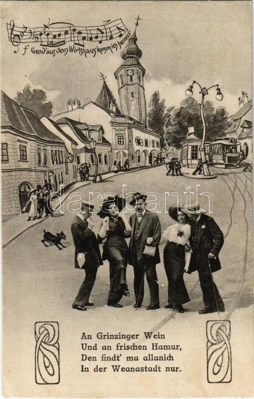 Beschreibung: Vienna, Wien XIX. Grinzing. Drunk men and women montage postcard with tram, music sheet. Verlag Josef Popper (EK)