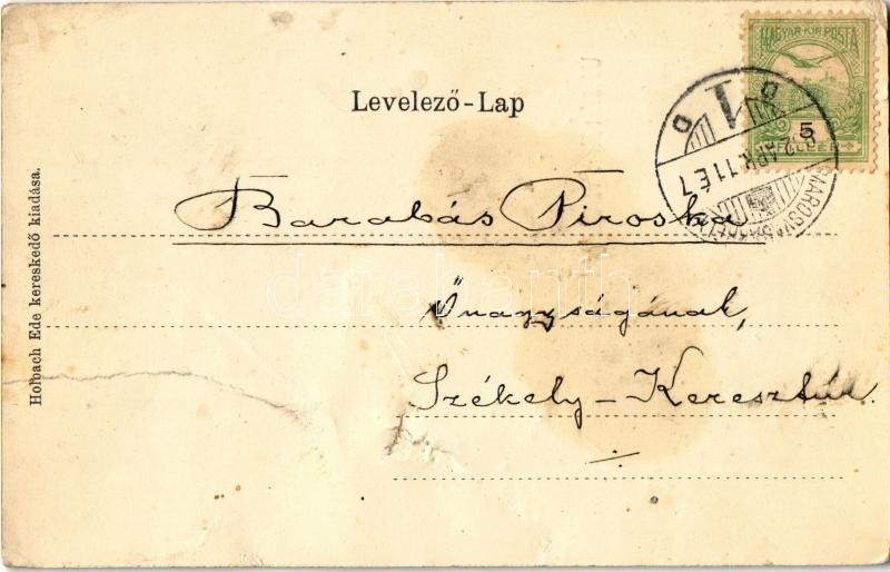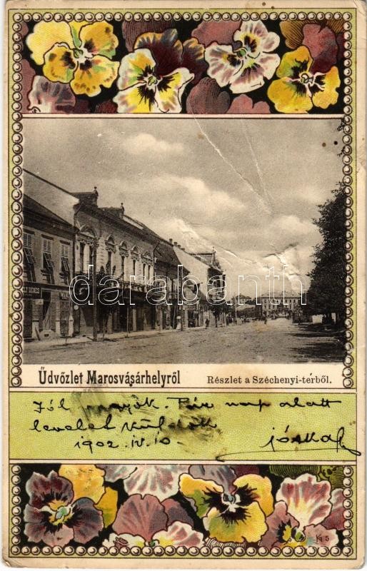 Beschreibung: 1902 Marosvásárhely, Targu Mures; Széchenyi tér, üzletek. Szecessziós virágos keret. Kiadja Holbach Ede / square, shops. Art Nouveau, floral, litho frame (b)