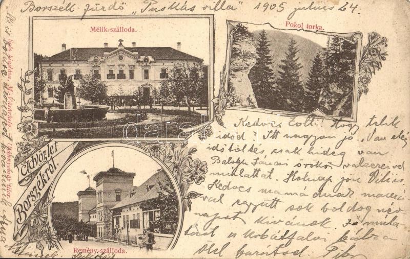 1905 Borszék, Borsec; Mélik és Remény szálloda, Pokol torka / hotels. ... https://www.darabanth.com/de/344-Fernauktion/344.0/Ansichtskarten/Siebenburgen~1500005/1905-Borszek-Borsec-Melik-es-Remeny-szalloda-Pokol-torka-hotels-Art-Nouveau-floral-lyuk~II1922619