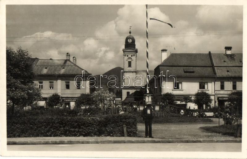 Beschreibung: Nagybánya, Baia Mare; Fő tér, Országzászló, üzletek / main square, Hungarian flag, shops