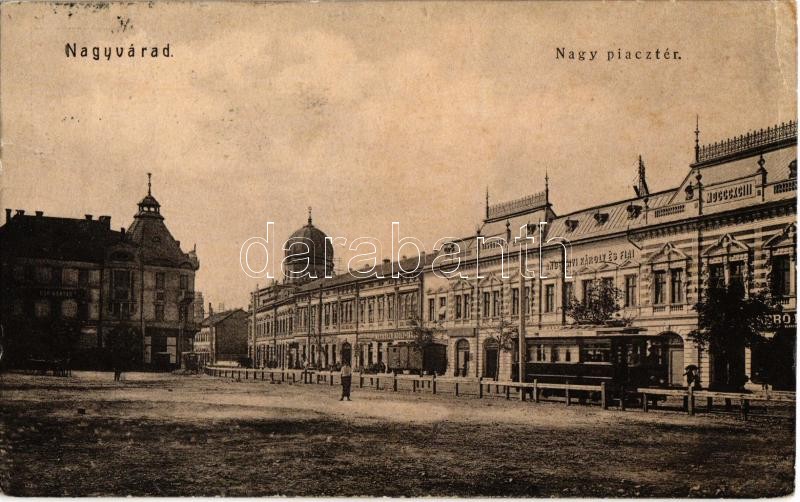 Nagyvárad, Oradea; Nagy piactér, Vasudvar, Wechsler Adolf és társa, Andrényi Károly és fiai üzlete, bor raktár, villamos, hátul az izraelita templom, zsinagóga. W. L. 972. / market square, shops, wine warehouse, tram, synagogue (EK)