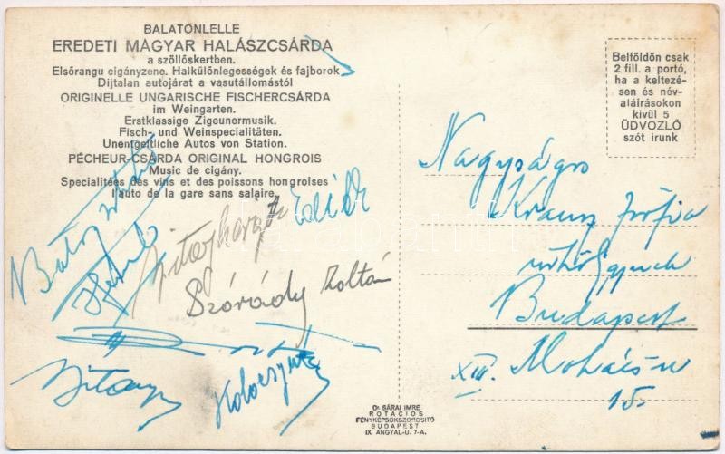 Balatonlelle, Eredeti magyar halászcsárda, elsőrangú cigányzene (EK) https://www.darabanth.com/de/344-Fernauktion/344.0/Ansichtskarten/Ungarn~1500004/Balatonlelle-Eredeti-magyar-halaszcsarda-elsorangu-ciganyzene-EK~II1941161